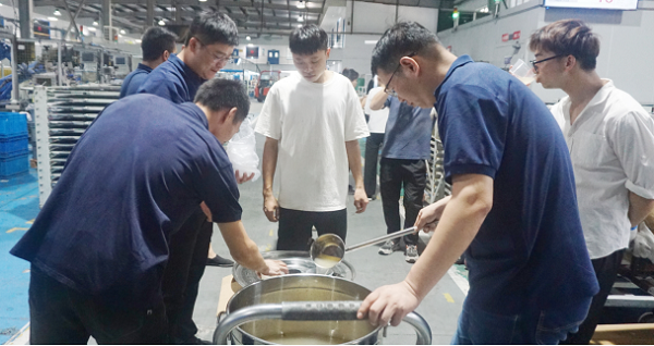 公司党支部组织了“送清凉小分队”,两位党员一组,每天下午将冰绿豆汤送到生产一线,送到每一位员工手中。一碗冰凉的绿豆汤,却让员工感受到火热的温暖!